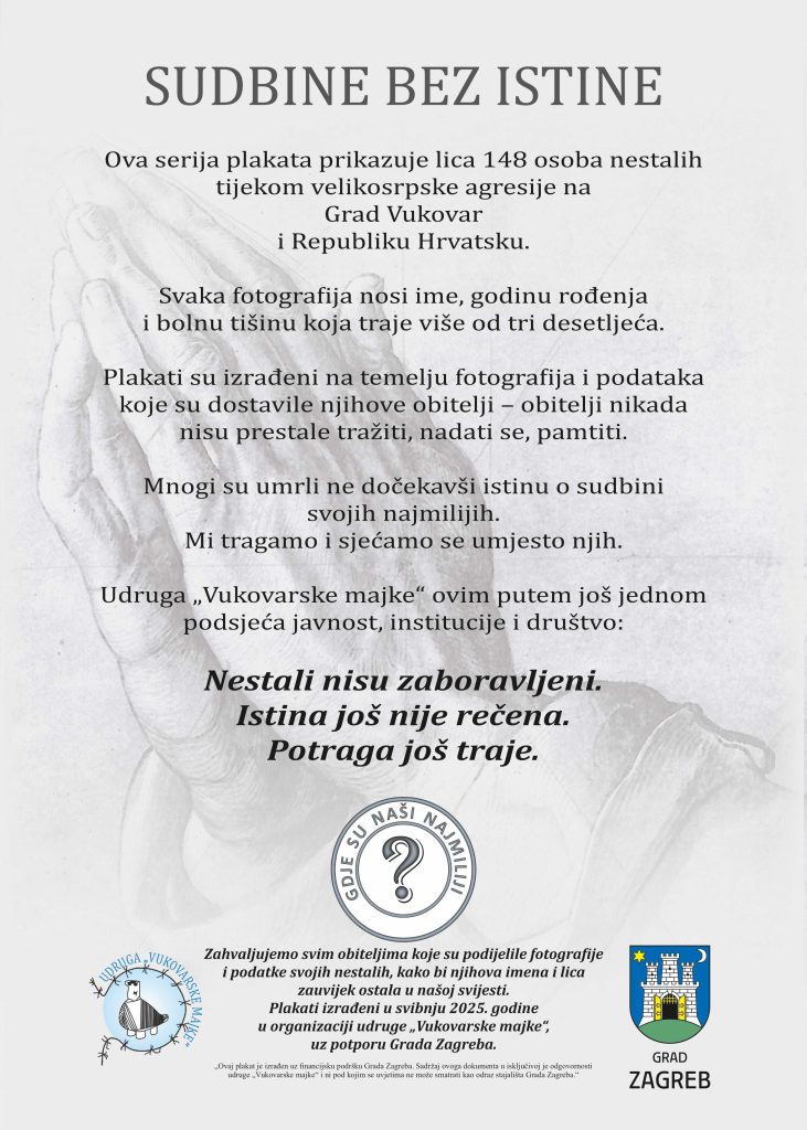 Plakati sa fotografijama nestalih osoba napravljeni su na temelju podataka i fotografija koje su članovi obitelji dostavili udruzi.