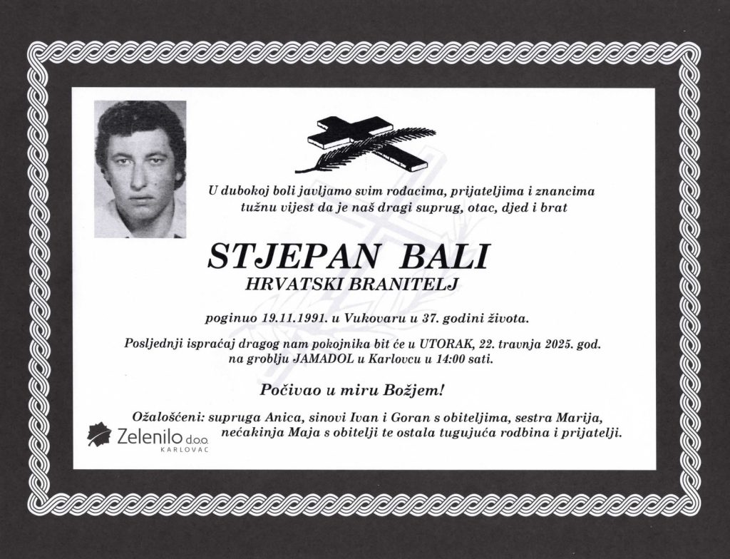 S dubokim poštovanjem dijelimo osmrtnicu hrvatskog branitelja Stjepana Balija, koji je svoj život izgubio 19. studenoga 1991. godine u Vukovaru.