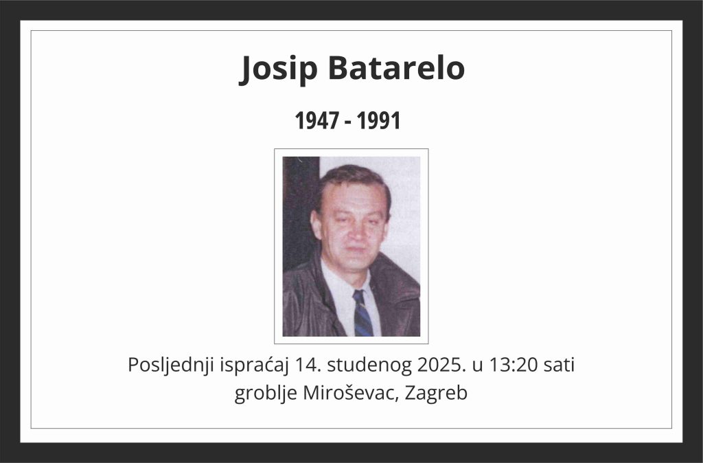 U petak, 14. studenoga 2025. godine, u 13:20 sati, na groblju Miroševac u Zagrebu, bit će održan posljednji ispraćaj Josipa Batarela (1947. – 1991.), hrvatskog branitelja i žrtve Domovinskog rata.