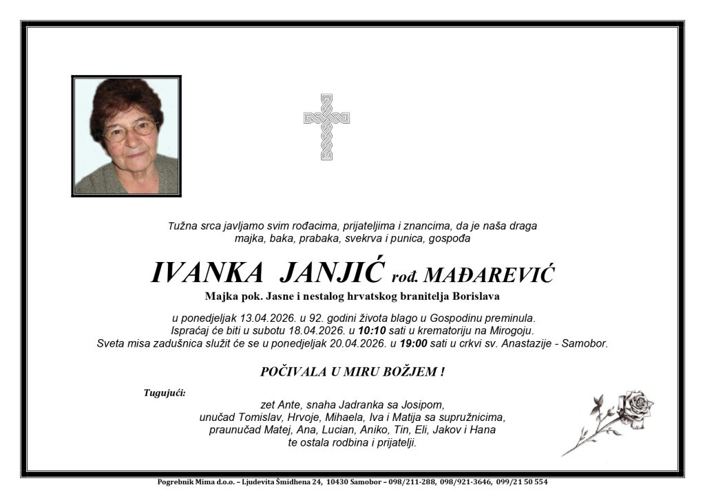 Ivanka Janjić, rođ. Čiča, majka pok. Jasne i nestalog hrvatskog branitelja Borislava, preminula je u ponedjeljak, 13. travnja 2026. godine u 92. godini života.