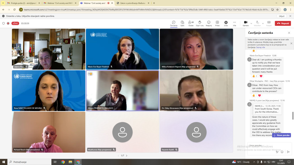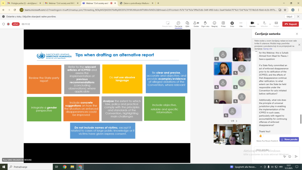 Webinar je organizirao Odbor za prisilne nestanke pri Ujedinjenim narodima, s ciljem jačanja suradnje između organizacija civilnog društva, nacionalnih institucija za ljudska prava (NHRI) i samog Odbora. Tijekom webinara raspravljalo se o izazovima i iskustvima u području zaštite prava nestalih osoba i njihovih obitelji, kao i o ulozi koju civilno društvo ima u nadzoru nad provedbom međunarodnih obveza.
