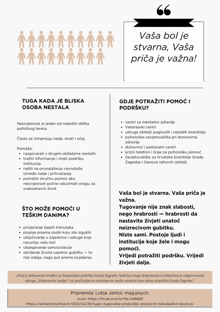 Letak je pripremila Lidija Jantol, mag. psych., a sadržaj je prilagođen specifičnim iskustvima i potrebama obitelji nestalih i poginulih hrvatskih branitelja.